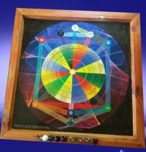 The second layer is the Tree of Life. I have stretched it to accommodate the wheel at the center, but it remains complete and unchanged in its traditional symbolism.It appears at first glance that Tipareth has been included in the wheel at the center of the Celestial Map, In actuality the wheel at the center of the board is open, so that you see Tipareth at the center of the whole Celestial Map. I have done this to invoke the guidance of the Higher Will not only of myself in the use of the Celestial Map, but that of anyone who is using the Celestial Map to seek information.