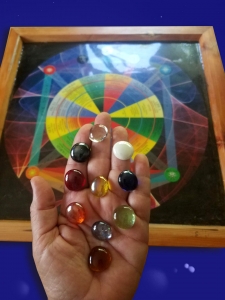 The Celestial Map consists of two parts, the markers, which represent the ever moving energies of life, both on a higher plane and in mundane expression, and the board, which represents all the different areas in which the moving energies may manifest.